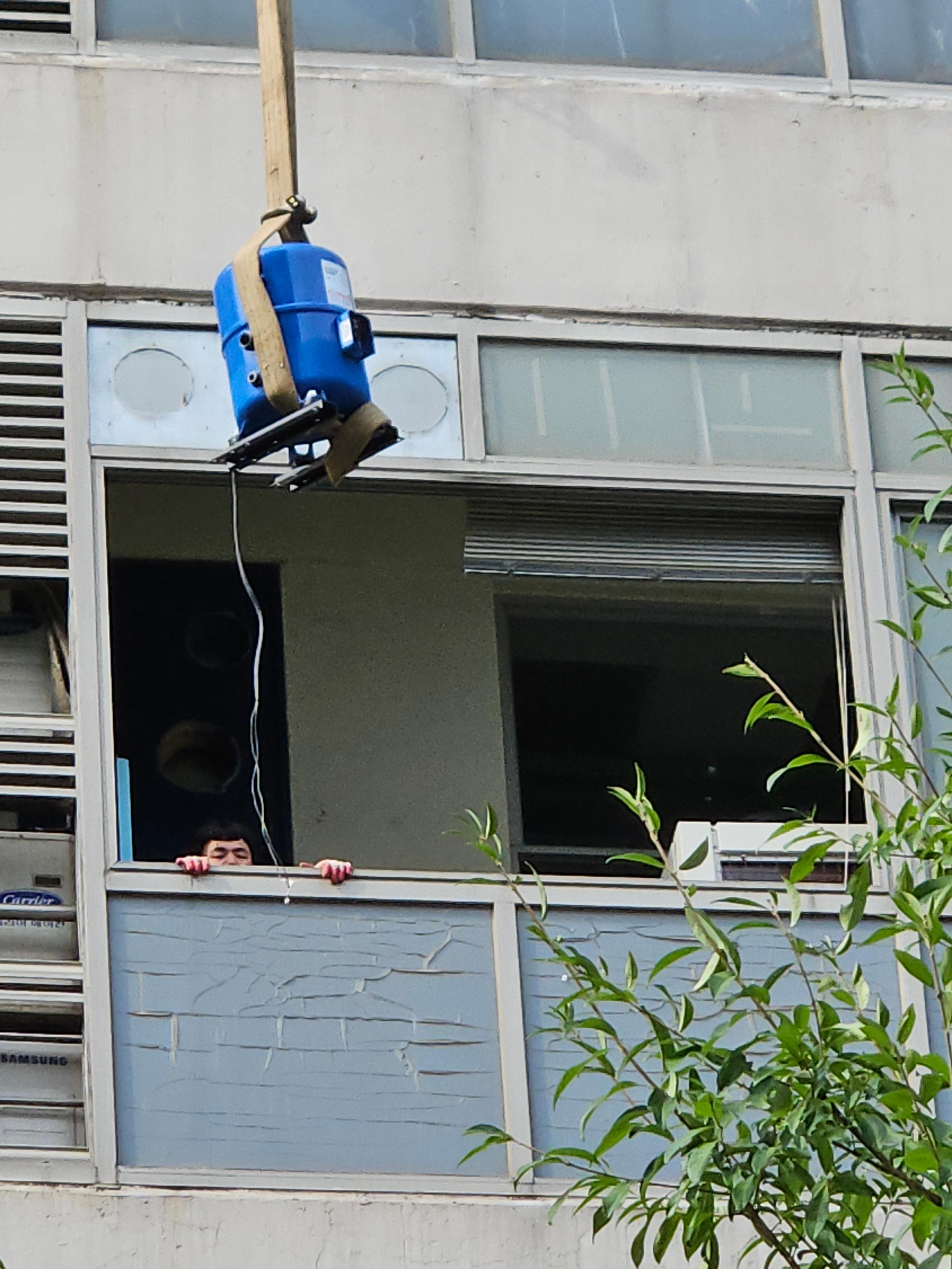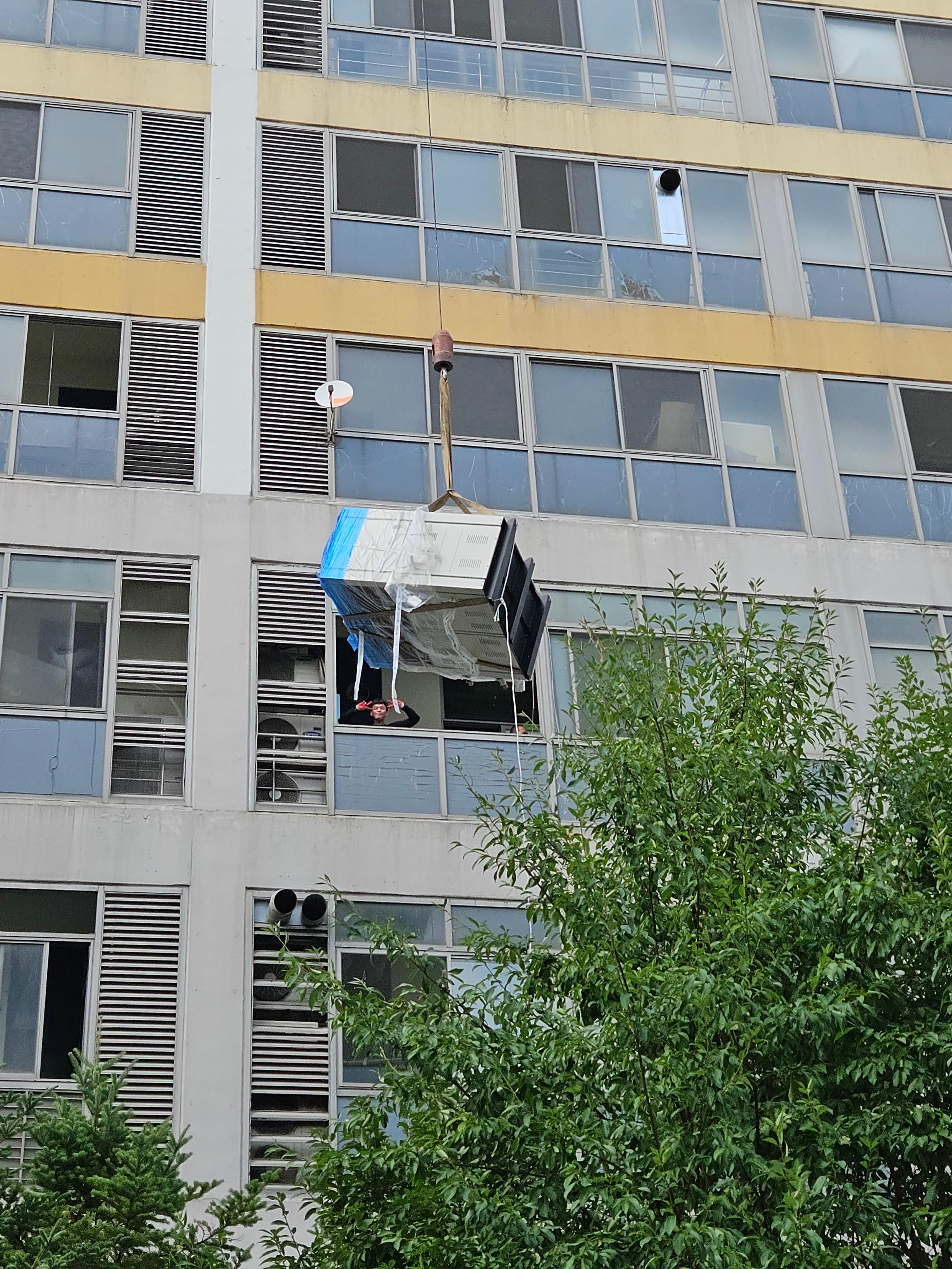 - 크레인으로 본체 이송 – 지상에서 베란다까지 안전하게 이동